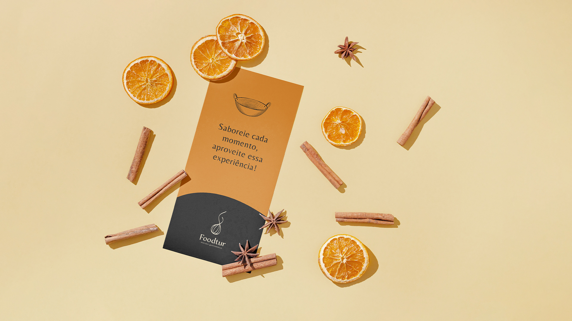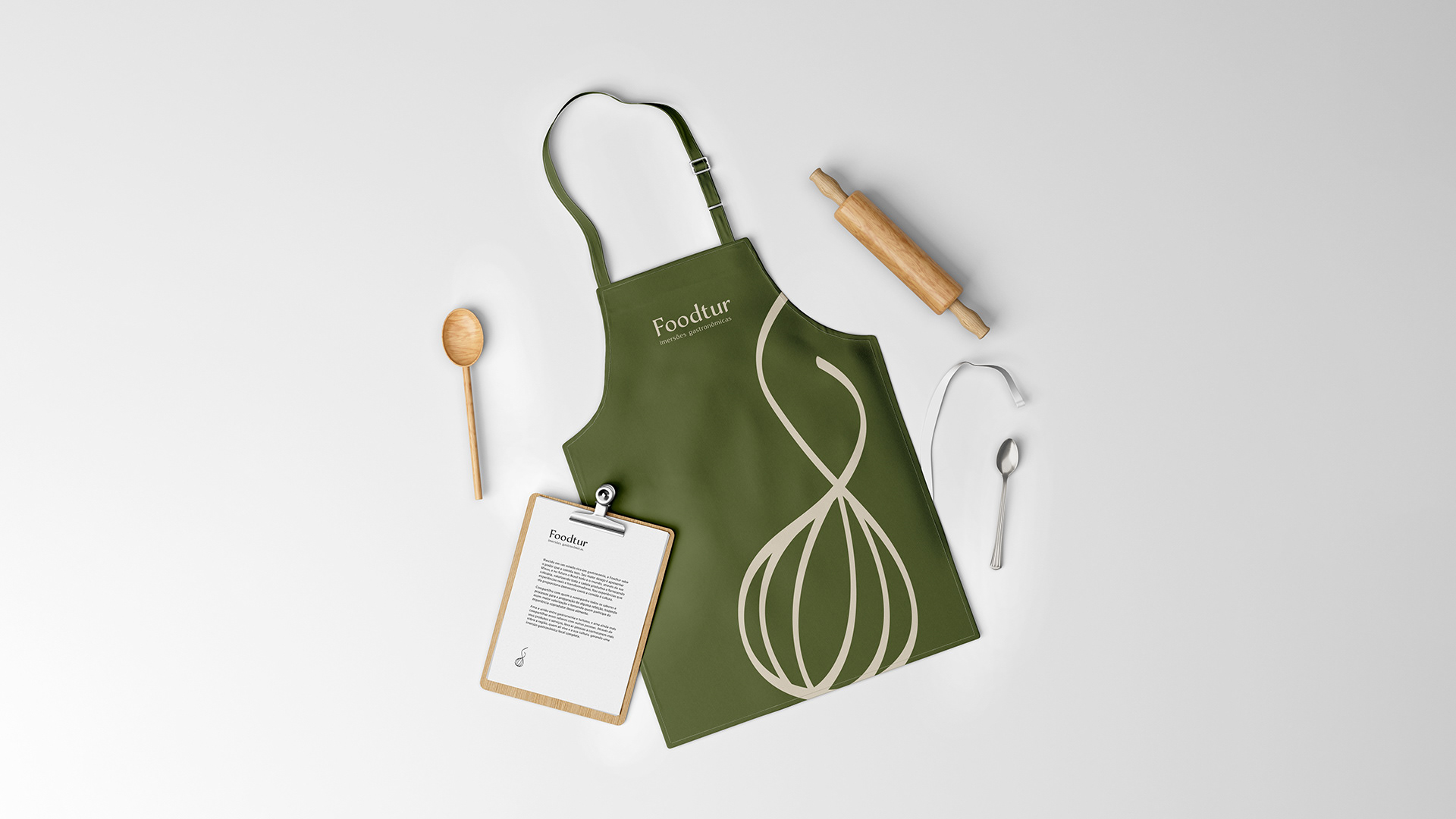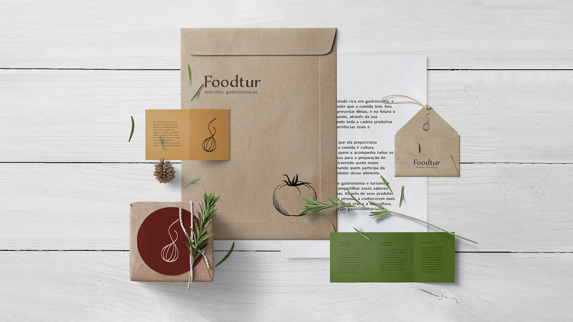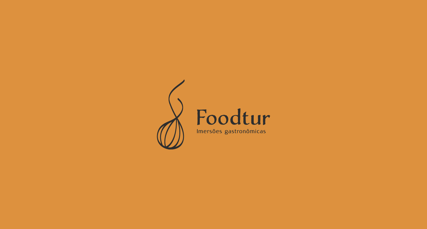 Desenho inspirado na forma de uma cebola, ingrediente marcante na tradicional comida mineira, em conjunto com a linha fluida e dinâmica que forma um laço ao redor dela, representando as experiências proporcionadas pela Foodtur.